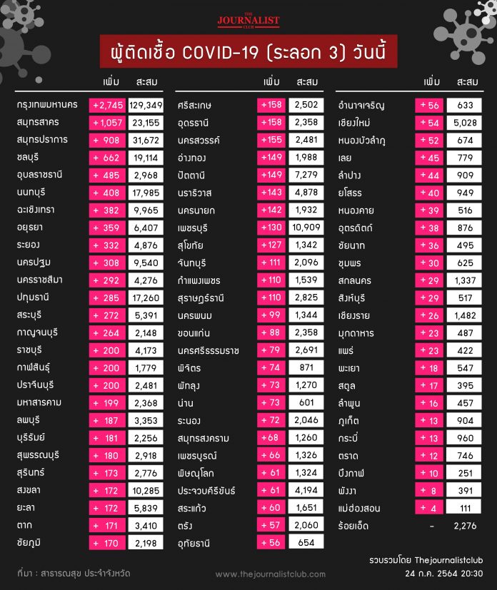 ผู้สื่อข่าวรายงานว่า สำหรับสถานการณ์โควิด-19 ประจำวันที่ 24 กรกฎาคม 2564 สรุปภาพรวมผู้ติดเชื้อโควิดใหม่ มีจำนวนทั้งสิ้น 76 จังหวัด ดังนี้