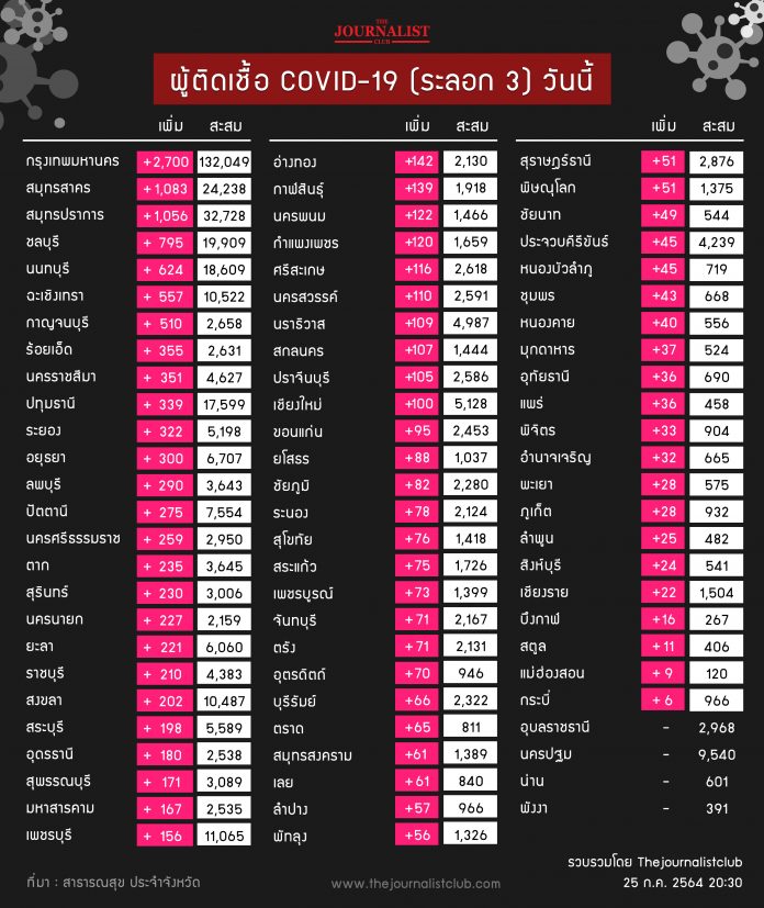 ผู้สื่อข่าวรายงานว่า สำหรับสถานการณ์โควิด-19 ประจำวันที่ 25 กรกฎาคม 2564 สรุปภาพรวมผู้ติดเชื้อโควิดใหม่ มีจำนวนทั้งสิ้น 73 จังหวัด ดังนี้