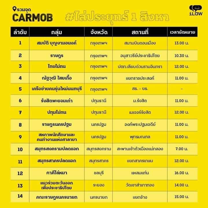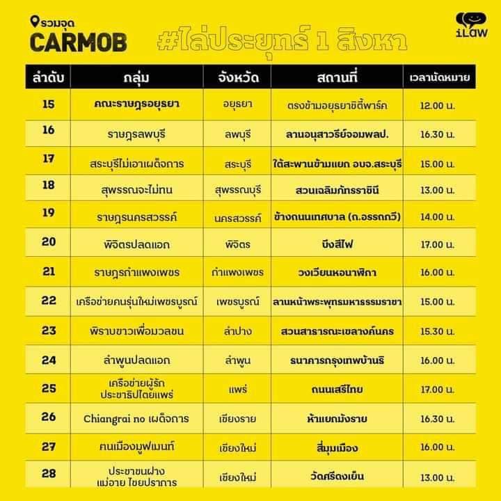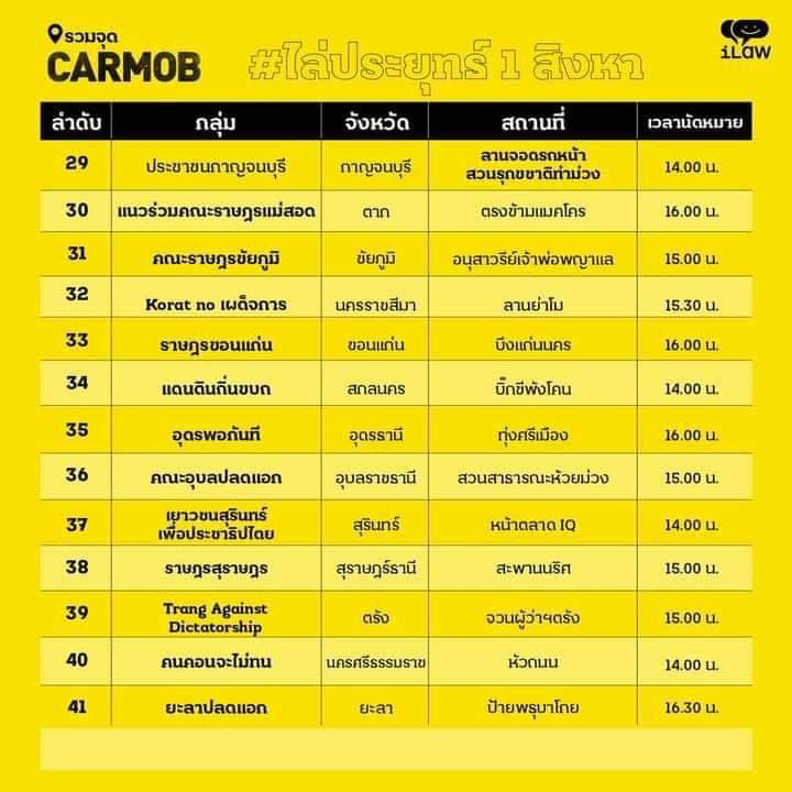 กิจกรรมคาร์ม็อบในพรุ่งนี้มีประชาชนประกาศร่วมจัดคู่ขนานในอย่างน้อย 41 ครั้งใน 34 จังหวัดทั่วประเทศ ชวนทุกคนร่วมบันทึกข้อมูลการใช้เสรีภาพในการชุมนุม โดยส่งมาให้เราได้ทาง FB : @iLawclub , Twitter : @ilawfx และ https://www.mobdatathailand.org/participant-form/