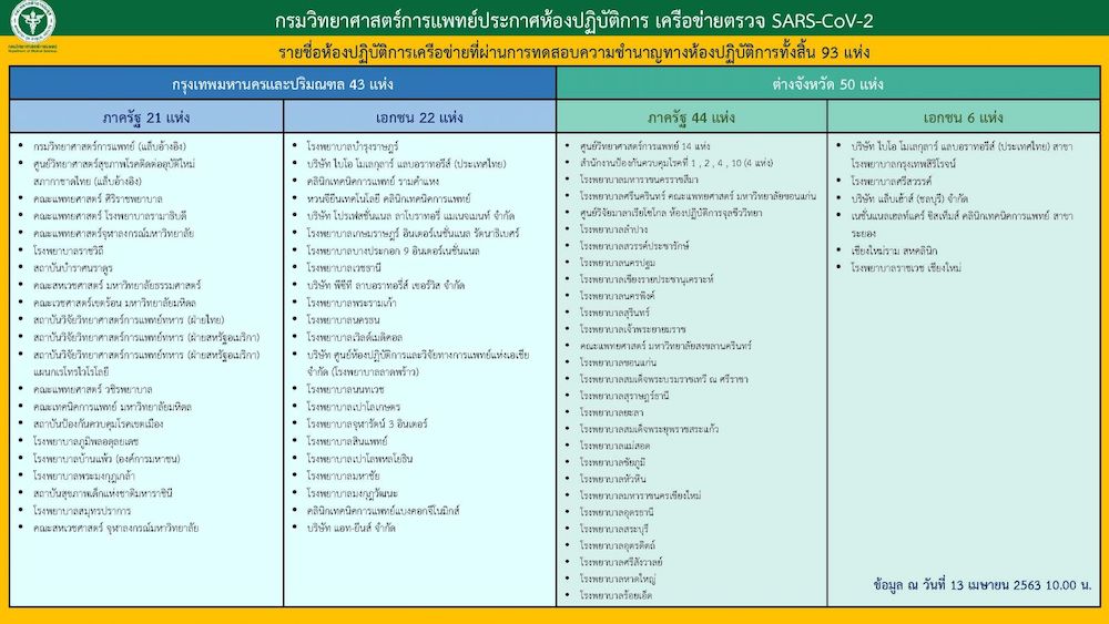 - ห้องปฏิบัติการทุกสังกัด 93 แห่ง ตรวจหาเชื้อไวรัสโควิด-19 แล้วกว่า 100,000 ตัวอย่าง