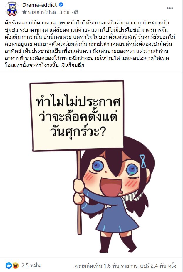 ด้านเพจ Drama-addict ของนายแพทย์ วิทวัส ศิริประชัย อดีตแพทย์ประจำโรงพยาบาลเกาะลันตา ได้โพสต์ตั้งคำถามว่า…ทำไมไม่ประกาศว่าจะล็อกตั้งแต่วันศุกร์