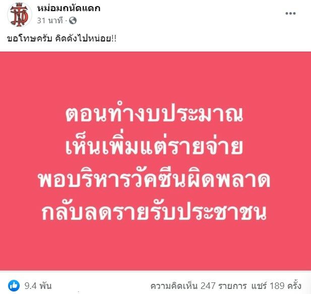 ขณะที่เพจ หม่อมถนัดแดก เพจของนายสหัสวรรษ ชอบชิงชัย ยูทูบเบอร์สายกินและเจ้าของร้านอาหารหม่อมถนัดแดก ในฐานะผู้ประกอบการร้านอาหาร ได้โพสต์ข้อความถึงรัฐบาล โดยระบุว่า…ตอนทำงบประมาณเห็นเพิ่มแต่รายจ่ายพอบริหารงานผิดพลาดกลับลดรายรับประชาชน