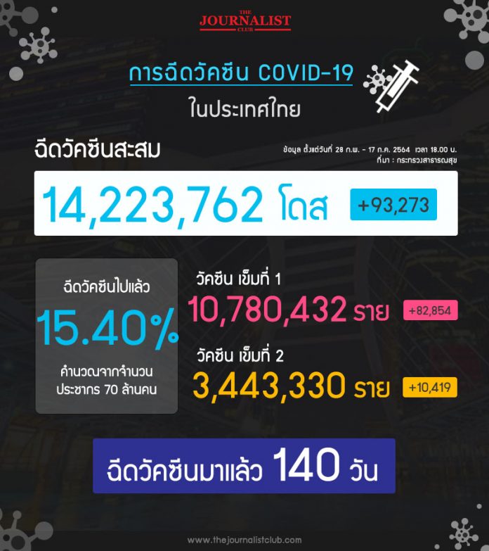 อย่างไรก็ตาม ณ วันที่ 18 ก.ค.2564 (ข้อมูลวันที่ 17 ก.ค.) รัฐบาลสามารถฉีดวัคซีนโควิด-19 ได้แล้วทั้งหมด 14.22 ล้านโดส คิดเป็น 15.40% ของประชากรชาวไทยทั้งหมด 70 ล้านคน โดยแบ่งเป็น วัคซีนเข็มที่ 1 จำนวน 10.78 ล้านราย และวัคซีนเข็มที่ 2 จำนวน 3.44 ราย