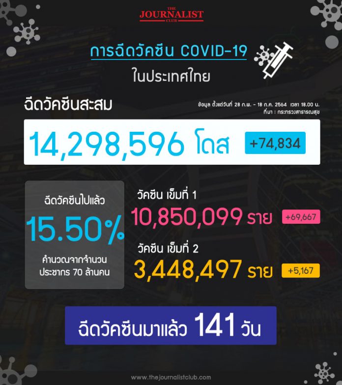อย่างไรก็ตาม ณ วันที่ 19 ก.ค.2564 (ข้อมูลวันที่ 18ก.ค.) รัฐบาลสามารถฉีดวัคซีนโควิด-19 ได้แล้วทั้งหมด 14.29 ล้านโดส คิดเป็น 15.50% ของประชากรชาวไทยทั้งหมด 70 ล้านคน โดยแบ่งเป็น วัคซีนเข็มที่ 1 จำนวน 10.85 ล้านราย และวัคซีนเข็มที่ 2 จำนวน 3.44 ราย