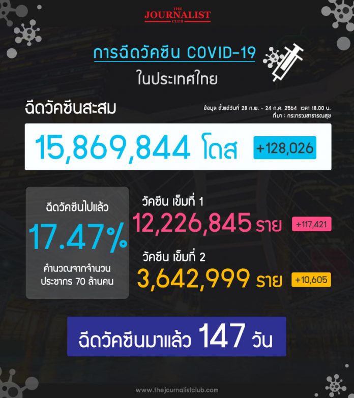 อย่างไรก็ตาม ณ วันที่ 25 ก.ค.2564 (ข้อมูลวันที่ 24 ก.ค.) รัฐบาลสามารถฉีดวัคซีนโควิด-19 ได้แล้วทั้งหมด 15.86 ล้านโดส คิดเป็น 17.47% ของประชากรชาวไทยทั้งหมด 70 ล้านคน โดยแบ่งเป็น วัคซีนเข็มที่ 1 จำนวน 12.22 ล้านราย และวัคซีนเข็มที่ 2 จำนวน 3.64 ราย