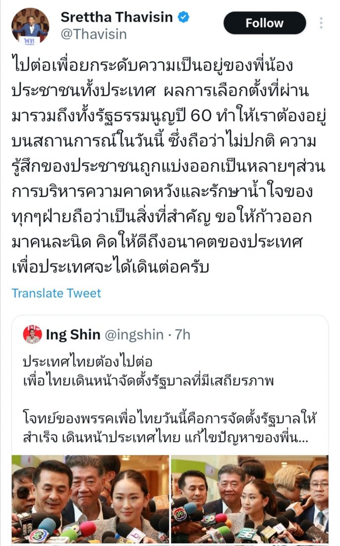 นายเศรษฐา ทวีสิน แคนดิเดตนายกรัฐมนตรีพรรคเพื่อไทย รีทวีตข้อความของน.ส.แพทองธาร ชินวัตร ที่ระบุหัวข้อว่า ประเทศไทยต้องไปต่อ เพื่อไทยเดินหน้าจัดตั้งรัฐบาลที่มีเสถียรภาพ โจทย์ของพรรคเพื่อไทยวันนี้คือการจัดตั้งรัฐบาลให้สำเร็จ เดินหน้าประเทศไทย แก้ไขปัญหาของพี่น้องประชาชน
