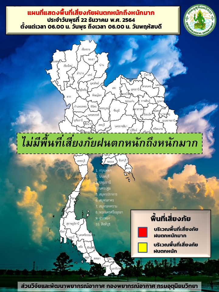 กรมอุตุนิยมวิทยา ได้พยากรณ์อากาศ 24 ชั่วโมงข้างหน้า ตั้งแต่เวลา 06.00 น.วันนี้ (22 ธ.ค.)​-เวลา 06.00 น.วันพรุ่งนี้ (23ธ.ค.)  บริเวณความกดอากาศสูงหรือมวลอากาศเย็นกำลังค่อนข้างแรงที่ปกคลุมประเทศไทยตอนบนมีกำลังอ่อนลง ทำให้บริเวณดังกล่าวมีอุณหภูมิสูงขึ้นกับมีหมอกในตอนเช้า แต่ยังคงมีอากาศเย็นถึงหนาวในภาคเหนือและภาคตะวันออกเฉียงเหนือ ส่วนภาคกลางและภาคตะวันออกมีอากาศเย็นในตอนเช้า สำหรับยอดดอยมีอากาศหนาวถึงหนาวจัด อุณหภูมิต่ำสุด 5-12 องศาเซลเซียส และยอดภูมีอากาศหนาว อุณหภูมิต่ำสุด 8-15 องศาเซลเซียส ในขณะที่คลื่นกระแสลมฝ่ายตะวันตกในระดับบนเคลื่อนผ่านภาคเหนือตอนบน ทำให้บริเวณดังกล่าวมีฝนเกิดขึ้นได้บางพื้นที่ ขอให้ประชาชนบริเวณประเทศไทยตอนบนดูแลรักษาสุขภาพเนื่องจากสภาพอากาศที่เปลี่ยนแปลงและระมัดระวังอันตรายจากการสัญจรผ่านบริเวณที่มีหมอก ส่วนเกษตรกรในภาคเหนือตอนบนควรระวังความเสียหายต่อผลผลิตทางการเกษตรที่จะเกิดขึ้นในระยะนี้ไว้ด้วย สำหรับมรสุมตะวันออกเฉียงเหนือที่พัดปกคลุมอ่าวไทยและภาคใต้มีกำลังอ่อนลง ลักษณะเช่นนี้ทำให้ภาคใต้ตอนล่างมีฝนลดลง แต่ยังคงมีฝนฟ้าคะนองบางแห่ง ส่วนคลื่นลมบริเวณอ่าวไทยและทะเลอันดามันมีกำลังอ่อน คลื่นสูงประมาณ 1 เมตร บริเวณที่มีฝนฟ้าคะนองคลื่นสูง 1-2 เมตร ขอให้ชาวเรือบริเวณอ่าวไทยและทะเลอันดามันเดินเรือด้วยความระมัดระวังบริเวณที่มีฝนฟ้าคะนอง
