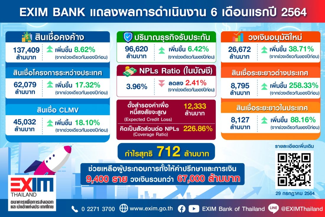 วันที่ 29 ก.ค.2564 นายรักษ์ วรกิจโภคาทร กรรมการผู้จัดการ ธนาคารเพื่อการส่งออกและนำเข้าแห่งประเทศไทย หรือ เอ็กซิมแบงก์ เปิดเผยว่า ในช่วง 6 เดือนของปี 64 (ม.ค.-มิ.ย.) เอ็กซิมแบงก์ ช่วยเหลือผู้ประกอบการทั้งด้านการให้คำปรึกษาและบริการทางการเงินในวิกฤตโควิด-19 ได้ 9,400 ราย วงเงินรวมกว่า 67,000 ล้านบาท มีสินเชื่อคงค้าง 137,409 ล้านบาท เพิ่มขึ้น 10,908 ล้านบาท หรือ 8.62% เมื่อเทียบกับช่วงเดียวกันของปีก่อน แบ่งเป็นสินเชื่อเพื่อการค้า 33,772 ล้านบาท และสินเชื่อเพื่อการลงทุน 103,637 ล้านบาทซึ่งเพิ่มขึ้นถึง 14.09% จากช่วงเดียวกันของปีก่อน มีกำไรสุทธิ 712 ล้านบาท โดยสินเชื่อทั้งหมด ก่อให้เกิดเงินหมุนเวียนในระบบธุรกิจ 87,888 ล้านบาท โดยจำนวนนี้เป็นปริมาณธุรกิจของผู้ประกอบการขนาดกลางและขนาดย่อม (เอสเอ็มอี) เท่ากับ 31,516 ล้านบาท หรือคิดเป็น 35.86% มีอัตราส่วนสินเชื่อที่ไม่ก่อให้เกิดรายได้ต่อสินเชื่อรวม (NPL Ratio) ณ สิ้นเดือนมิถุนายน 2564 ที่ 3.96%