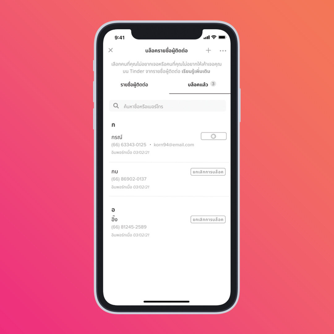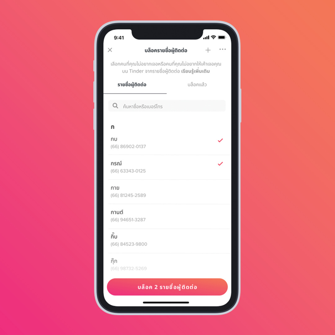 ทั้งนี้จากข้อมูลเหล่านี้ ทำให้ทินเดอร์ออกฟีเจอร์ Block Contacts ที่ช่วยให้สมาชิกสามารถบล็อกรายชื่อติดต่อบนแอปฯ เพื่อให้พวกเขากล้าที่จะสปาร์คกับคนใหม่ๆ ได้อย่างมั่นใจ และช่วยเลี่ยงความอึดอัด หากว่าพวกเขาต้องปัดไปเจอคนคุ้นเคยที่พวกเขาไม่อยากจะเห็นบนแอปฯ