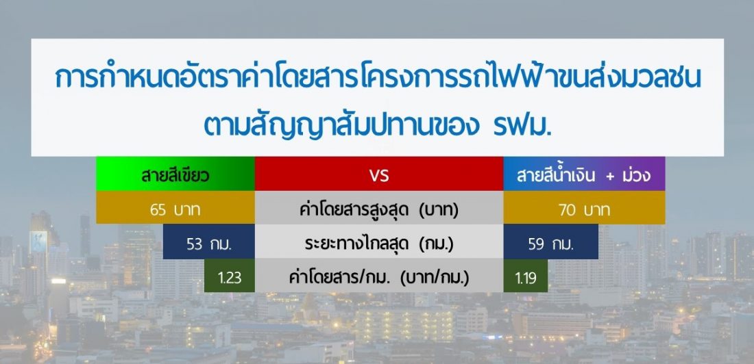 1)การเดินทางที่ไกลที่สุดจาก MRT สายสีม่วงไปยัง MRT สายสีน้ำเงินอยู่ที่ประมาณ 59 กิโลเมตร โดยมีอัตราค่าโดยสาร 70 บาท ซึ่งหากพิจารณาแล้วจะเห็นว่า ประชาชนมีภาระค่าโดยสารเฉลี่ยเพียง 1.18 บาท/กิโลเมตร เท่านั้น ซึ่งถูกกว่าภาระค่าโดยสารเฉลี่ยของ กทม. และไม่ได้เป็นไปตามที่ถูกกล่าวอ้าง