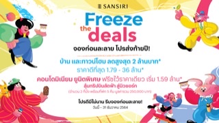 ทั้งนี้มาร่วมฟรีซส่งมอบความสุขดีๆ ให้คนไทยมีบ้านง่ายขึ้น กับโปรโมชั่นสุดยิ่งใหญ่ “Freeze The Deals” รีบจองก่อนละลาย ฟรีซดีลที่ดีสุดวันนี้ – 31 ธ.ค.นี้ ดูข้อมูลเพิ่มเติมคลิก http://siri.ly/eXz3uAA พร้อมติดตามความเคลื่อนไหวและโปรโมชั่นดีๆ จากแสนสิริได้ทาง Facebook : Sansiri PLC