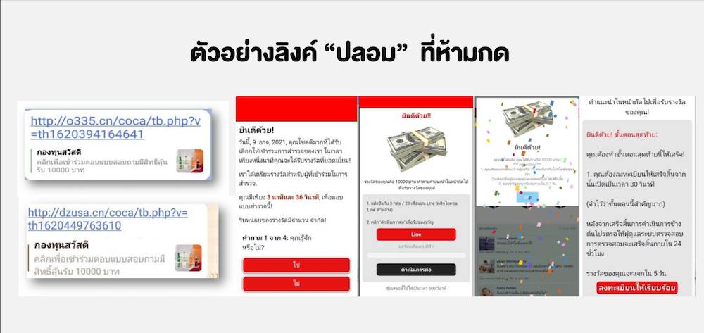 “ไม่ว่าจะเป็นฟิชชิ่ง หลอกให้เข้าเว็บไซต์ปลอมเพื่อลวงเอาข้อมูลส่วนตัว, การฉวยโอกาสจากสถานการณ์ปัจจุบันในสังคม เช่น การจองคิวฉีดวัคซีน, การหลอกถามเลข OTP-One Time Password แล้วนำไปสวมรอยทำธุรกรรมทางการเงิน, โฆษณา แบบ Pop up หลอกว่าตรวจพบไวรัสและให้กดเพื่อทำลาย, ข่าวปลอมต่างๆ ที่ลวงให้แชร์ต่อ เป็นต้น” นางสายชล กล่าว