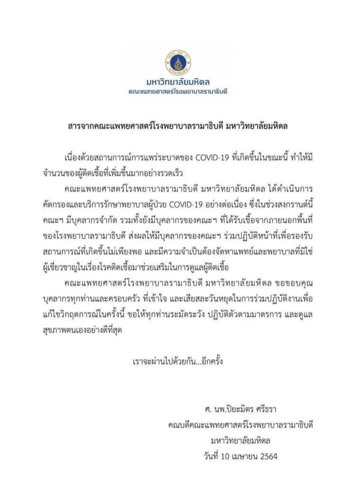 เมื่อวันที่ 10 เมษายน ศ.นพ.ปิยะมิตร ศรีธรา คณบดีคณะแพทยศาสตร์โรงพยาบาลรามาธิบดี มหาวิทยาลัยมหิดล ออกสารจากคณะแพทยศาสตร์ โรงพยาบาลรามาธิบดีมหาวิทยาลัยมหิดล โดยระบุว่า เนื่องด้วยสถานการณ์การแพร่ระบาดของ COVID-19 ที่เกิดขึ้นในขณะนี้ทำให้มีจำนวนของผู้ติดเชื้อที่เพิ่มขึ้นมากอย่างรวดเร็ว