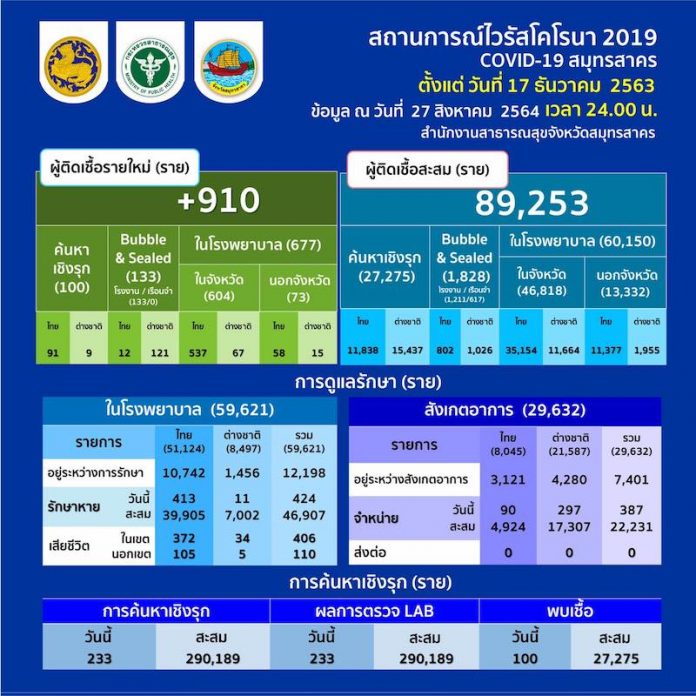 ผู้สื่อข่าวรายงานว่า เพจCOVID-19 สมุทรสาคร ได้โพสต์ข้อมูลว่า สถานการณ์การติดเชื้อ COVID-19 สมุทรสาคร ณ เวลา 24.00 น.วันที่ วันที่ 27 สิงหาคม 2564 พบผู้ป่วยรายใหม่ 910 ราย ผู้ป่วยยืนยันสะสม 89,253 ราย หายป่วย/จำหน่ายแล้ว 69,138 ราย เสียชีวิตสะสม 516 ราย