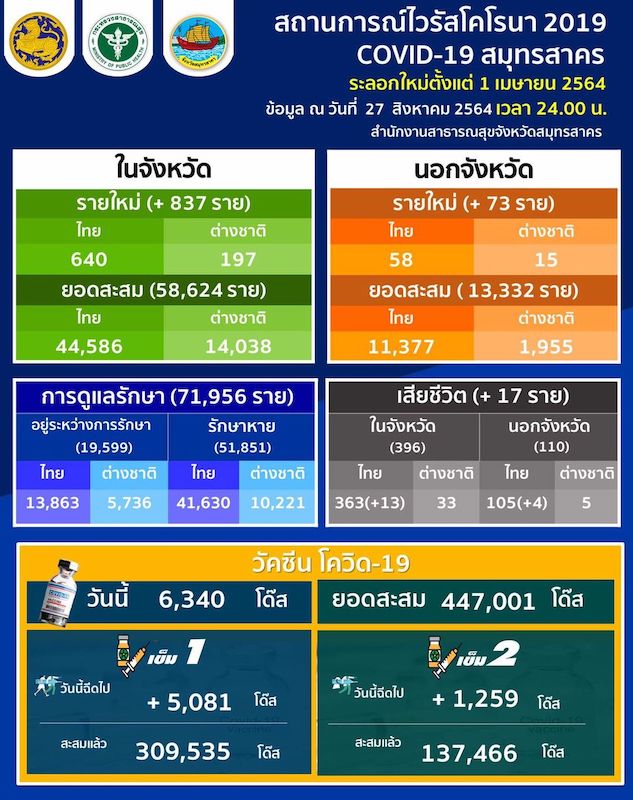 ผู้สื่อข่าวรายงานว่า เพจCOVID-19 สมุทรสาคร ได้โพสต์ข้อมูลว่า สถานการณ์การติดเชื้อ COVID-19 สมุทรสาคร ณ เวลา 24.00 น.วันที่ วันที่ 27 สิงหาคม 2564 พบผู้ป่วยรายใหม่ 910 ราย ผู้ป่วยยืนยันสะสม 89,253 ราย หายป่วย/จำหน่ายแล้ว 69,138 ราย เสียชีวิตสะสม 516 ราย