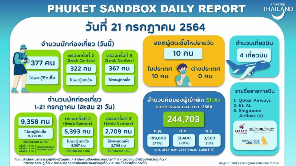 นายธนกร วังบุญคงชนะ เลขานุการรัฐมนตรีประจำสำนักนายกรัฐมนตรี ในฐานะโฆษกประจำศูนย์บริหารสถานการณ์เศรษฐกิจจากผลกระทบจากการระบาดของโรคติดเชื้อไวรัสโคโรนา 2019 (ศบศ.) เปิดเผยว่า วันนี้ (22 กรกฎาคม 2564) นายกรัฐมนตรี ได้เป็นประธานการประชุมศูนย์บริหารสถานการณ์เศรษฐกิจจากผลกระทบจากการระบาดของโรคติดเชื้อไวรัสโคโรนา 2019 (ศบศ.) ครั้งที่ 3/2564 ผ่านระบบ VDO Conference โดยพล.อ.ประยุทธ์ได้เน้นย้ำถึงความสำเร็จของโครงการ Phuket Sandbox พร้อมชื่มชมการทำงานร่วมกันของภาครัฐและเอกชน โดยพบว่ามีจำนวนนักท่องเที่ยวสะสมตั้งแต่วันที่ 1 – 21 กรกฎาคม 2564 รวม 9,358 คน ขณะที่ยอดการจองห้องพักตามมาตรฐาน SHA+ สะสมระหว่างเดือนกรกฎาคมถึงเดือนกันยายนอยู่ที่ 244,703 คืน คิดเป็นอัตราการเข้าพักร้อยละ 10.12 สร้างรายรับการท่องเที่ยว 534.31 ล้านบาท โดยที่ประชุมได้ให้ความสำคัญกับการดำเนินงานของหน่วยงานที่เกี่ยวข้องต่าง ๆ ให้ดำเนินการอย่างเคร่งครัดในการร่วมมือกันเพื่อควบคุมการระบาดให้ดี