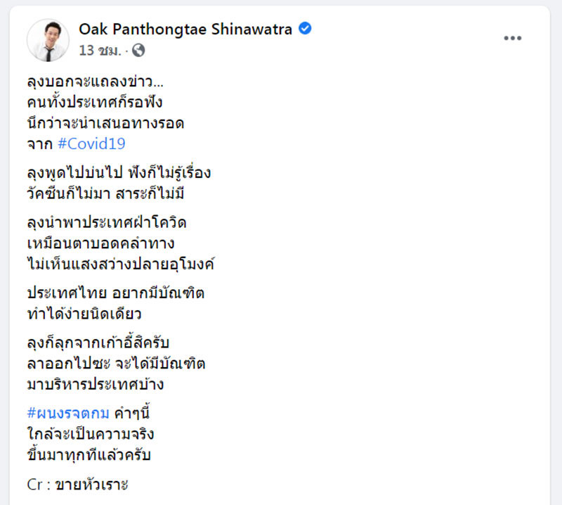 นายพานทองแท้ ชินวัตร ลูกชาย นายทักษิณ ชินวัตร อดีตนายกรัฐมนตรี ได้โพสต์ข้อความลงบนเฟซบุ๊กส่วนตัว “Oak Panthongtae Shinawatra” ระบุว่า… ลุงบอกจะแถลงข่าว… คนทั้งประเทศก็รอฟัง นึกว่าจะนำเสนอทางรอด จาก #Covid19