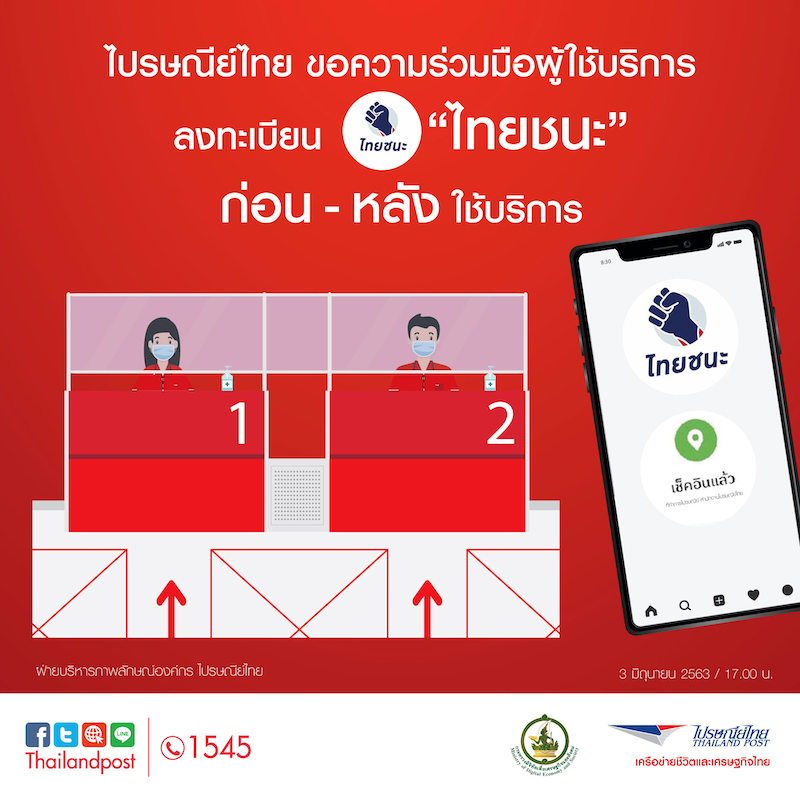 นายก่อกิจ ด่านชัยวิจิตร กรรมการผู้จัดการใหญ่ บริษัท ไปรษณีย์ไทย จำกัด เปิดเผยว่า ไปรษณีย์ไทย ได้ดำเนินมาตรการความปลอดภัยตามนโยบายรัฐบาลอย่างเคร่งครัดในช่วงคลายล็อกดาวน์การแพร่ระบาดไวรัสโควิด-19 เพื่อมิให้เกิดการแพร่ระบาดอีก โดยขอความร่วมมือผู้ใช้บริการเช็คอิน-เช็คเอาท์ ผ่านเว็บไซต์ www.ไทยชนะ.comผ่านแพลตฟอร์ ไทยชนะ ด้วยการสแกน คิวอาร์โคด (QR Code) หากผู้ใช้บริหารไม่สะดวกในการใช้มือถือ ทางไปรษณีย์ไทย ได้จัดแบบฟอร์มกรอกข้อมูลที่จำเป็นสำหรับผู้ใช้บริการที่ไม่มีสะดวก และ ณ ที่ทำการไปรษณีย์ไทยทุกแห่ง ได้ดำเนินการมาตรการเว้นระยะห่างทางสังคม เพื่อสร้างความมั่นใจให้กับผู้ใช้บริการ ขณะเดียวกันเข้มความปลอดภัยด้านชีวอนามัยอย่างต่อเนื่อง อาทิ พนักงานไปรษณีย์ไทยสวมหน้ากากอนามัย มีฉากพลาสติกกั้น เพื่อเว้นระยะห่าง มีเจลแอลกอฮอลล์ทำความสะอาดมือถือ และมีการความสะอาดอย่างต่อเนื่องทุก 20 นาที เป็นต้น