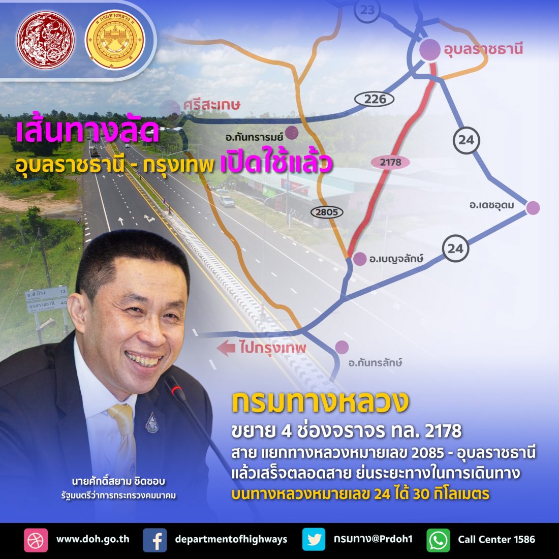 นายสราวุธ ทรงศิวิไล อธิบดีกรมทางหลวง (ทล.)เปิดเผยว่า ขณะนี้กรมทางหลวงได้ดำเนินโครงการก่อสร้างขยายทางหลวงหมายเลข 2178 สาย แยกทางหลวงหมายเลข 2085 – อุบลราชธานี เป็น 4 ช่องจราจรแล้วเสร็จ เพื่อพัฒนาโครงข่ายทางหลวงระหว่างจังหวัดในภูมิภาคอีสานใต้ รองรับการคมนาคมขนส่งสินค้าชายแดนไทย-อินโดจีน ทั้งนี้การก่อสร้างเส้นทาง ทางหลวงหมายเลข 2178 สาย วารินชำราบ-หนองงูเหลือม เริ่มจากเขตเทศบาลเมืองวารินชำราบ อำเภอวารินชำราบ จังหวัดอุบลราชธานีนั้นจะ ผ่านอำเภอสำโรง อำเภอโนนคูณ สิ้นสุดที่ทางหลวงหมายเลข 2085 ตำบลหนองงูเหลือม อำเภอเบญจลักษณ์ จังหวัดศรีสะเกษ