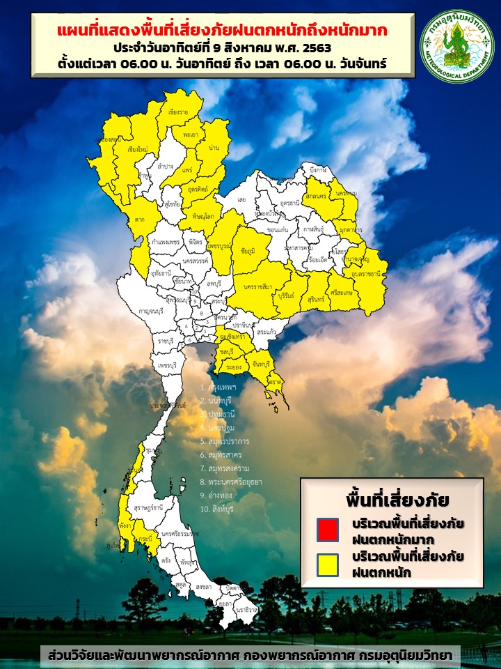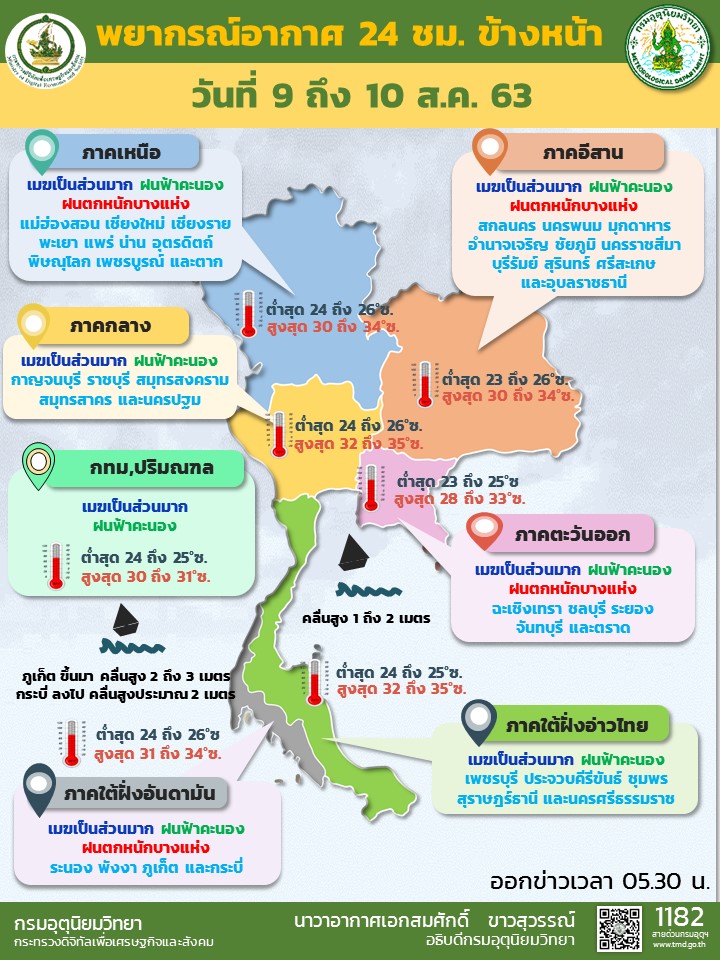 กรมอุตุนิยมวิทยา ได้พยากรณ์อากาศ 24 ชั่วโมงข้างหน้า ตั้งแต่เวลา 06:00 น.วันนี้(9 ส.ค.) – 06:00 น.วันพรุ่งนี (10 ส.ค.) ร่องมรสุมได้เลื่อนขึ้นไปพาดผ่านภาคเหนือตอนบนและภาคตะวันออกเฉียงเหนือตอนบน เข้าสู่หย่อมความกดอากาศต่ำบริเวณทะเลจีนใต้ตอนบน ประกอบกับมรสุมตะวันตกเฉียงใต้ที่พัดปกคลุมทะเลอันดามัน ประเทศไทย และอ่าวไทยมีกำลังแรง ทำให้ยังมีฝนตกหนักบางพื้นที่บริเวณภาคเหนือ ภาคตะวันออกเฉียงเหนือ ภาคตะวันออก และภาคใต้ฝั่งตะวันตก