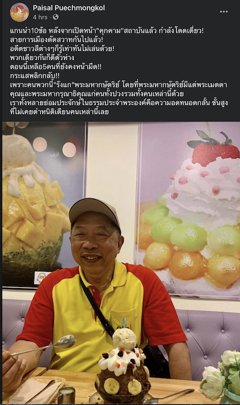 ผู้สื่อข่าวรายงานว่า ไพศาล พืชมงคล ได้โพสต์ข้อความผ่านเฟซบุกส่วนตัว “ Paisal Puchmongkol” มีเนื้อหาระบุว่า แกนนำ10 ข้อ หลังจากเปิดหน้า”คุกคาม”สถาบันแล้ว กำลังโดดเดี่ยว!