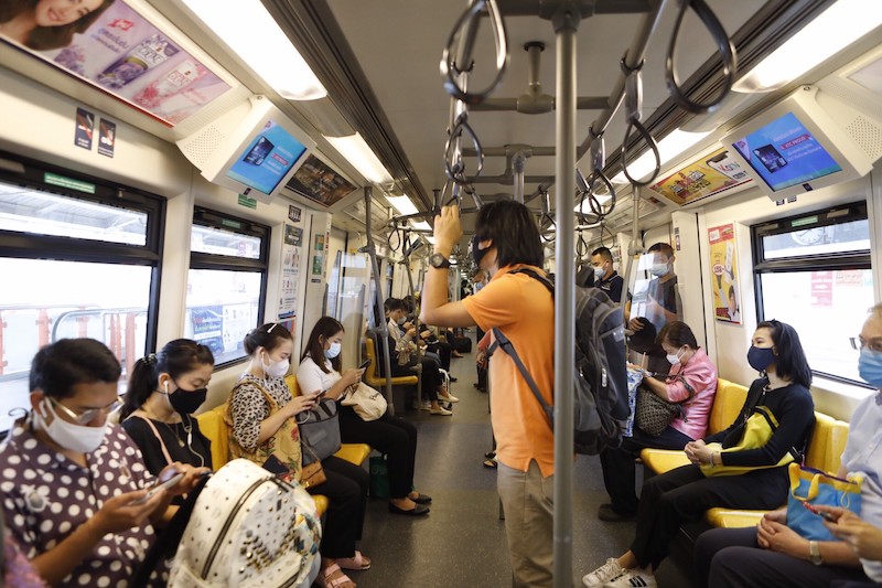 2. ให้ผู้โดยสารทุกท่านต้องสวมหน้ากากอนามัย/หน้ากากผ้า และตลอดเวลาที่ใช้บริการ ไม่นำหน้ากากลงมาไว้ใต้คาง พร้อมทั้งงดการพูดคุยภายในขบวนรถไฟฟ้า หลีกเลี่ยงการหันหน้าเข้าหากัน เว้นระยะห่างในการยืน และนั่งภายในขบวนรถไฟฟ้า และชานชาลา
