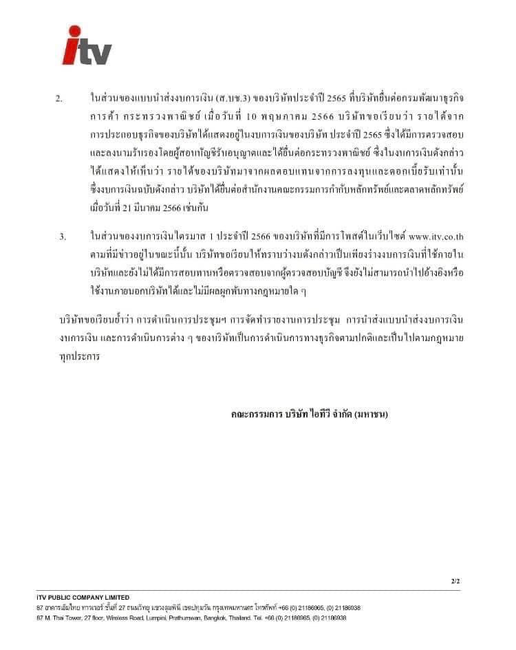 3.ในส่วนของงบการเงินไตรมาส 1 ประจำปี 2566 ของบริษัทที่มีการโพสต์ในเว็บไซต์ www.itv.co.th ตามที่มีข่าวอยู่ในขณะนี้นั้น บริษัทขอเรียนให้ทราบว่างบดังกล่าวเป็นเพียงร่างงบการเงินที่ใช้ภายในบริษัทและยังไม่ได้มีการสอบทานหรือตรวจสอบจากผู้ตรวจสอบบัญชี จึงยังไม่สามารถนำไปอ้างอิงหรือใช้งานภายนอกบริษัทได้และไม่มีผลผูกพันทางกฎหมายใด ๆ