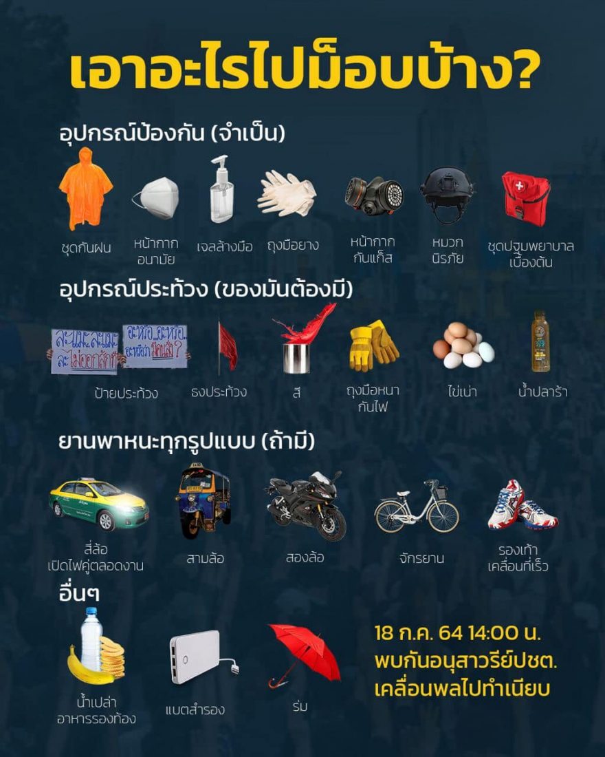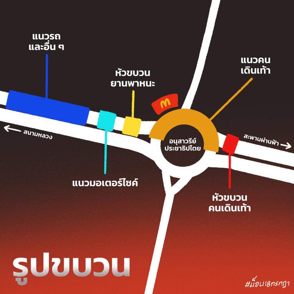 ใครจะเดินเท้าขอให้รวมตัวกันบริเวณฝั่งร้านแมคโดนัลด์, ใครมากับรถยนต์ มอเตอร์ไซค์ รถตุ๊กๆ หรือยานพากนะใดๆ จุดรวมพลจะอยู่หลังรถปราศรัยหน้าศึกษาภัณฑ์เก่า กินเลนทั้งหมด 3 เลน (เพื่อเปิดทางรถ กรณีฉุกเฉิน) อย่าลืมเปิดไฟฉุกเฉินเพื่อให้ทีมความปลอดภัยอำนวยความสะดวกให้คุณหน้างาน