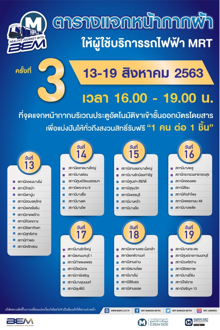 รายงานข่าวจาก บริษัท ทางด่วนและรถไฟฟ้ากรุงเทพ จำกัด (มหาชน) หรือ BEM เดินหน้าโครงการ “Healthy Journey with BEM” ในกิจกรรมแจกหน้ากากผ้าฟรี 1 ล้านชิ้น! ให้กับผู้โดยสารรถไฟฟ้า MRT อย่างต่อเนื่อง ตั้งแต่เดือนมิถุนายน กรกฎาคม มาจนถึงครั้งที่ 3 เดือนสิงหาคมซึ่งเป็นเดือนสุดท้ายของกิจกรรม เพื่อตอบแทนความห่วงใย ขอบคุณจากหัวใจ และสร้างความมั่นใจให้กับผู้ใช้บริการรถไฟฟ้า MRT ในการเดินทางอย่างปลอดภัย ห่างไกล COVID-19 ซึ่งที่ผ่านมา BEM ได้ส่งมอบหน้ากากผ้าให้กับผู้โดยสารอย่างทั่วถึง ในสถานีรถไฟฟ้าสายสีน้ำเงินและสายสีม่วง