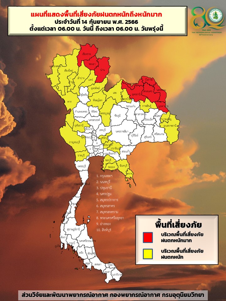 สภาพอากาศวันนี้(14ก.ย.)ฝนตกหนักมากใน 9 จังหวัดเหนือ-อีสาน ทั่วประเทศไทยฝนฟ้าคะนองร้อยละ 30-80