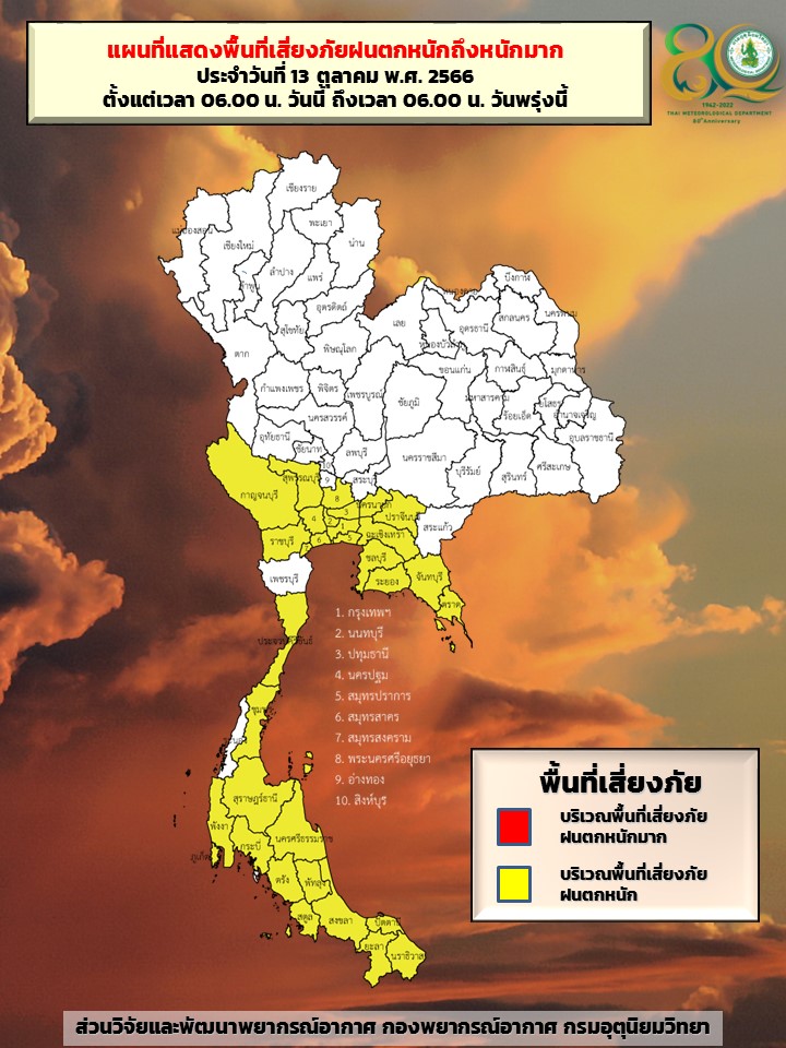 สภาพอากาศวันนี้(13ต.ค.) กรมอุตุนิยมวิทยาพยากรณ์อากาศ 24 ชั่วโมงข้างหน้าตั้งแต่เวลา 06.00น.วันนี้ ถึง เวลา06.00น. วันพรุ่งนี้(14ต.ค.)บริเวณความกดอากาศสูงหรือมวลอากาศเย็นกำลังปานกลางจากประเทศจีนแผ่ลงมาปกคลุมภาคตะวันออกเฉียงเหนือ ภาคเหนือ และทะเลจีนใต้ ทำให้ร่องมรสุมเลื่อนลงไปพาดผ่านอ่าวไทย และภาคใต้ ในขณะที่มรสุมตะวันตกเฉียงใต้พัดปกคลุมทะเลอันดามัน ภาคใต้ และอ่าวไทยตอนล่าง