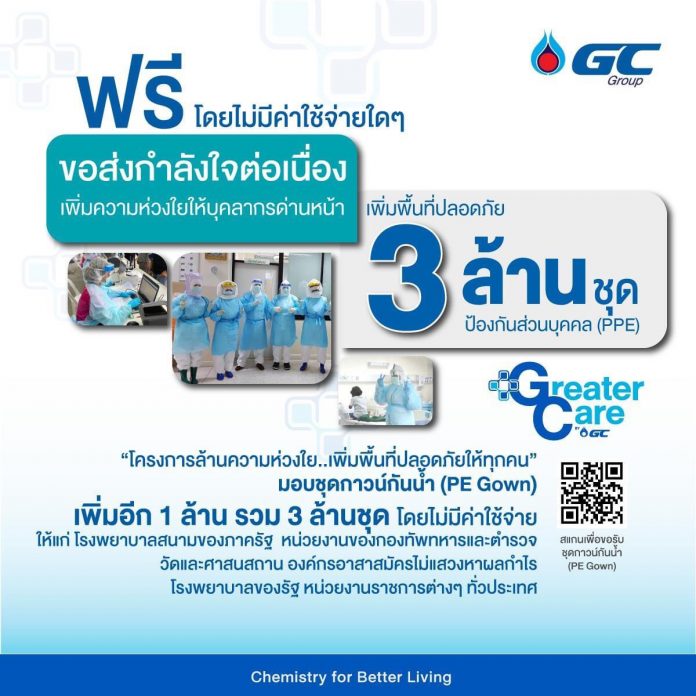 ผู้สื่อข่าวรายงานว่า ท่ามกลางการแพร่ระบาดของเชื้อไวรัสโควิด-19 ทำให้ บริษัท พีทีที โกลบอล เคมิคอล จำกัด (มหาชน) หรือ GC ยังคงเดินหน้าสนับสนุนอุปกรณ์ป้องกันทางการแพทย์อย่างต่อเนื่อง เพื่อเป็นส่วนหนึ่งในการส่งความห่วงใย เพิ่มพื้นที่ปลอดภัยให้บุคลากรทางการแพทย์ด่านหน้า โดยได้ริเริ่มโครงการ ‘ล้านความห่วงใย..เพิ่มพื้นที่ปลอดภัยให้ทุกคน’ เพื่อมารับมือกับวิกฤตโควิด 19 โดยก่อนหน้านี้ GC ได้ร่วมมือกับพันธมิตรทุกภาคส่วน ส่งมอบชุดกาวน์กันน้ำ (PE Gown) ภายใต้แบรนด์ Greater Care by GC ไปแล้วกว่า 2 ล้านชุด ในครั้งนี้ GC ได้เพิ่มการบริจาอีก 1 ล้านชุด รวมเป็น 3 ล้านชุด โดยบุคคลากรทางการแพทย์ สามารถติดต่อขอรับได้ฟรี ที่นี่ https://forms.gle/iQSFp1GypMQeF7R46