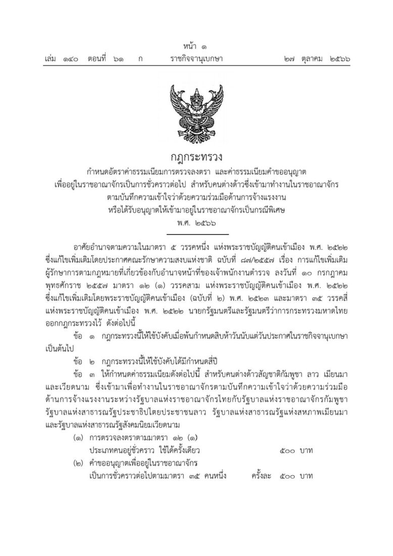 น.ส.ไตรศุลี ไตรสรณกุล เลขานุการ รมว.มหาดไทยและโฆษกกระทรวงมหาดไทย กล่าวว่า เมื่อวันที่ 27 ต.ค. 2566 ราชกิจจานุเบกษา ได้เผยแพร่ กฎกระทรวง การกำหนดอัตราค่าธรรมเนียมการตรวจลงตรา และค่าธรรมเนียมคำขออนุญาตเพื่อยู่ในราชอาณาจักรเป็นการชั่วคราวต่อไป สำหรับคนต่างด้าวซึ่งเข้ามาทำงานในราชอาณาจักรตามบันทึกความเข้าใจว่าด้วยความร่วมมือด้านการจ้างแรงงานหรือได้รับอนุญาตให้เข้ามาอยู่ในราชอาณาจักรเป็นกรณีพิเศษ พ.ศ. 2566