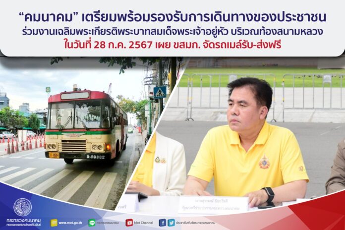 “คมนาคม” เตรียมพร้อมรองรับการเดินทางของประชาชน ร่วมงานเฉลิมพระเกียรติพระบาทสมเด็จพระเจ้าอยู่หัว บริเวณท้องสนามหลวง ในวันที่ 28 ก.ค. 2567 ขสมก. จัดรถเมล์รับ-ส่งฟรี 10 กลุ่มเส้นทาง ด้าน “กรมเจ้าท่า” จัดบริการฟรีเรือโดยสาร 6 เส้นทาง