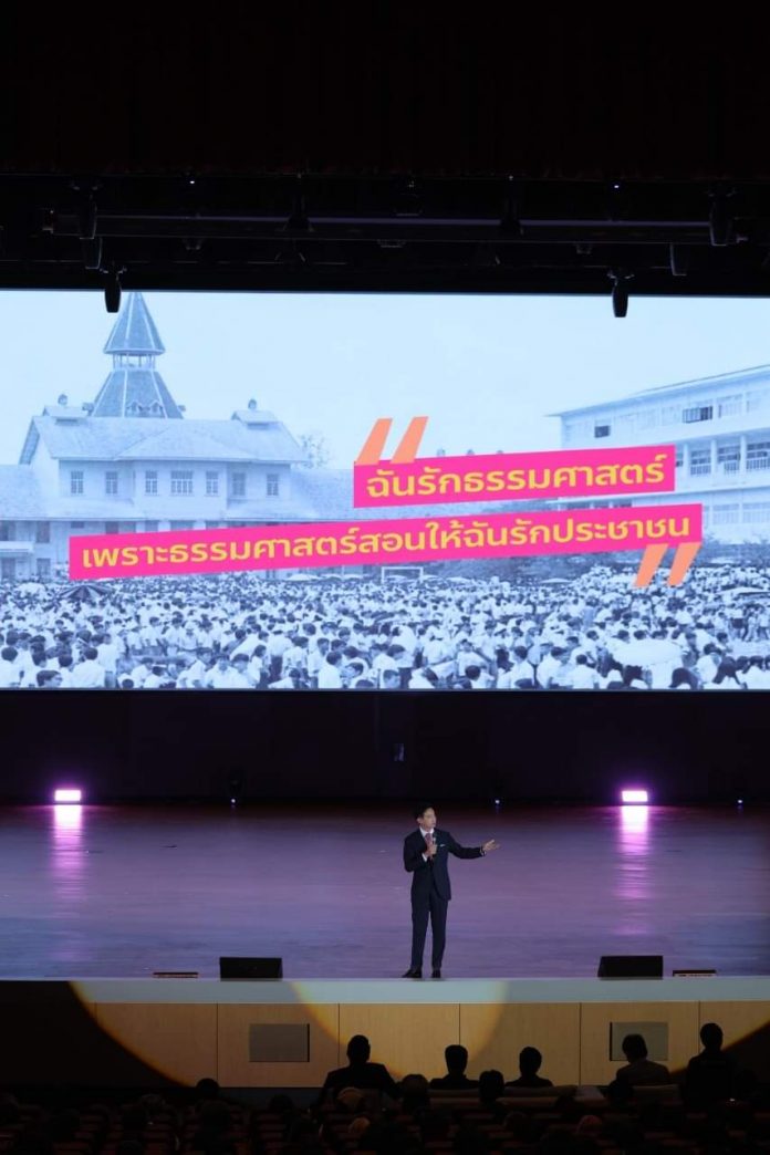 ผม พิธา ลิ้มเจริญรัตน์ ปัจจุบันเป็นหัวหน้าพรรคก้าวไกล แคนดิเดตนายกรัฐมนตรี ไม่ต้องแปลกใจว่าทำไมที่ทำงานของผม ถึงมีคนจากรั้วธรรมศาสตร์เยอะมาก ก็เพราะ “วิถีก้าวไกล” ก็มาจาก “จิตวิญญาณธรรมศาสตร์” ไม่มากก็น้อย