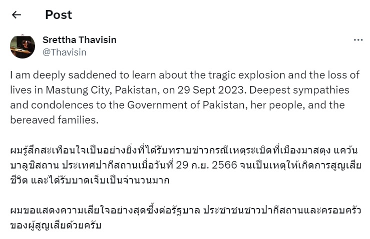 ผมรู้สึกสะเทือนใจเป็นอย่างยิ่งที่ได้รับทราบข่าวกรณีเหตุระเบิดที่เมืองมาสตุง แคว้นบาลูชิสถาน ประเทศปากีสถานเมื่อวันที่ 29 ก.ย. 2566 จนเป็นเหตุให้เกิดการสูญเสียชีวิต และได้รับบาดเจ็บเป็นจำนวนมาก