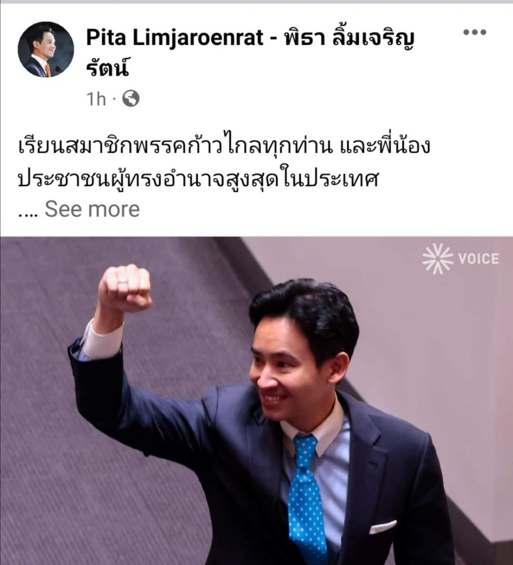 ผมขอยืนยันกับทุกท่านว่า ไม่ว่าสถานะของผมจะเป็นอย่างไร ผมไม่ได้หายไปไหน แต่จะยังคงทำงานร่วมกับพรรคก้าวไกลและพี่น้องประชาชนอย่างสุดกำลังและสุดความสามารถเพื่อขับเคลื่อนวาระการเปลี่ยนแปลงที่เราปรารถนาร่วมกัน