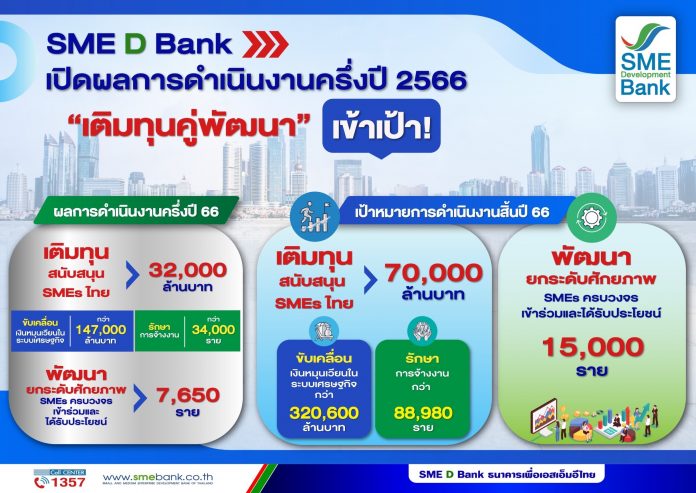 นางสาวนารถนารี รัฐปัตย์ กรรมการผู้จัดการ ธนาคารพัฒนาวิสาหกิจขนาดกลางและขนาดย่อมแห่งประเทศไทย(ธพว.) หรือ SME D Bank เปิดเผยผลการดำเนินงานธนาคารในครึ่งแรกปี 2566 ที่ผ่านมา (ม.ค.-มิ.ย.66) ว่าธนาคารฯ สามารถสนับสนุนผู้ประกอบการ SMEs เข้าถึงกระบวนการ “เติมทุนคู่พัฒนา” เป็นไปตามเป้าหมายที่ตั้งไว้โดย “ด้านเติมทุน” พาเข้าถึงแหล่งเงินทุนรวมมากกว่า 32,000 ล้านบาท สร้างประโยชน์ช่วยให้เกิดเงินหมุนเวียนในระบบเศรษฐกิจไทยกว่า 147,000 ล้านบาท รักษาการจ้างงานกว่า 34,000 ราย