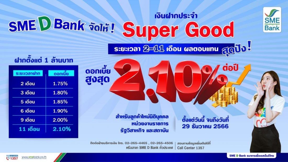 นางสาวนารถนารี รัฐปัตย์ กรรมการผู้จัดการ ธนาคารพัฒนาวิสาหกิจขนาดกลางและขนาดย่อมแห่งประเทศไทย(ธพว.) หรือ SME D Bank เปิดเผยว่า SME D Bank ธนาคารเพื่อเอสเอ็มอีไทย เปิดตัวผลิตภัณฑ์เงินฝากประจำรูปแบบใหม่ “Super Good” วงเงินรวม 500 ล้านบาท จุดเด่นฝากระยะสั้นเริ่มต้นแค่ 2 เดือน ถึง 11 เดือน ช่วยให้บริหารการเงินได้คล่องตัว รับผลตอบแทนสูง ดอกเบี้ยสูงสุด 2.10% ต่อปี สำหรับลูกค้าใหม่ กลุ่มนิติบุคคล หน่วยงานราชการ รัฐวิสาหกิจ และสถาบัน