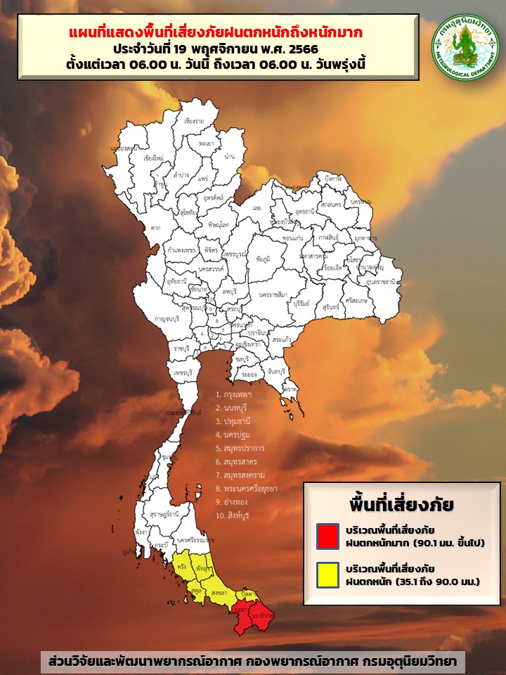 ตอนล่างของภาค : มีฝนฟ้าคะนอง ร้อยละ 40 ของพื้นที่ และมีฝนตกหนักถึงหนักมากบางแห่งบริเวณจังหวัดพัทลุง สงขลา ปัตตานี ยะลา และนราธิวาส