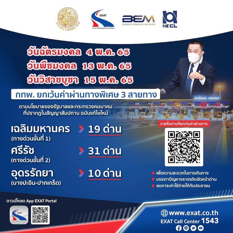 การทางพิเศษแห่งประเทศไทย (กทพ.) กระทรวงคมนาคม ได้ยกเว้นค่าผ่านทางพิเศษของทางพิเศษ รวม 3 สายทางฟรีในเดือนพฤษภาคม ได้แก่ ทางพิเศษเฉลิมมหานคร จำนวน 19 ด่าน ,ทางพิเศษศรีรัช จำนวน 31 ด่าน , ทางพิเศษอุดรรัถยา จำนวน 10 ด่าน